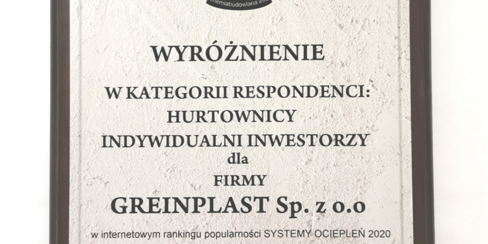 Ranking "Firma Roku - Systemy Ociepleń 2020" został oficjalnie rozstrzygnięty już jakiś czas temu. Natomiast przed kilkoma dniami dotarły do nas dyplomy, które potwierdzają zwycięstwo Greinplast, jak również wyróżnienia w kategorii respondentów w tym prestiżowym plebiscycie corocznie organizowanym przez branżowy portal chemiabudowlana.org