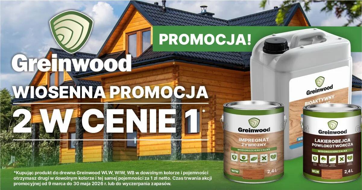 Zasada jest prosta: wybierasz produkt do drewna z serii Greinwood, a drugi taki sam otrzymujesz za symboliczne 1 zł netto!