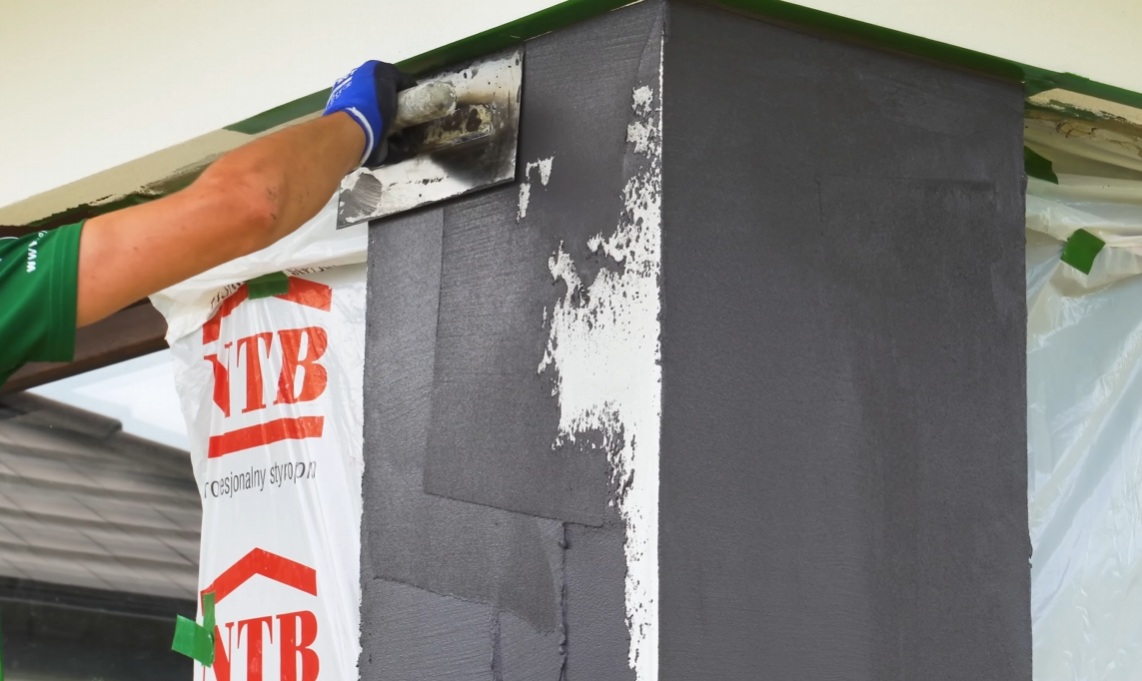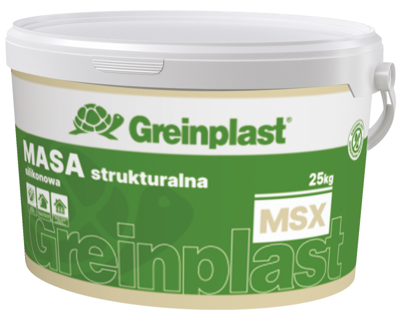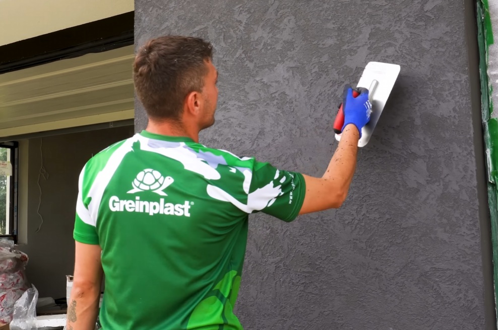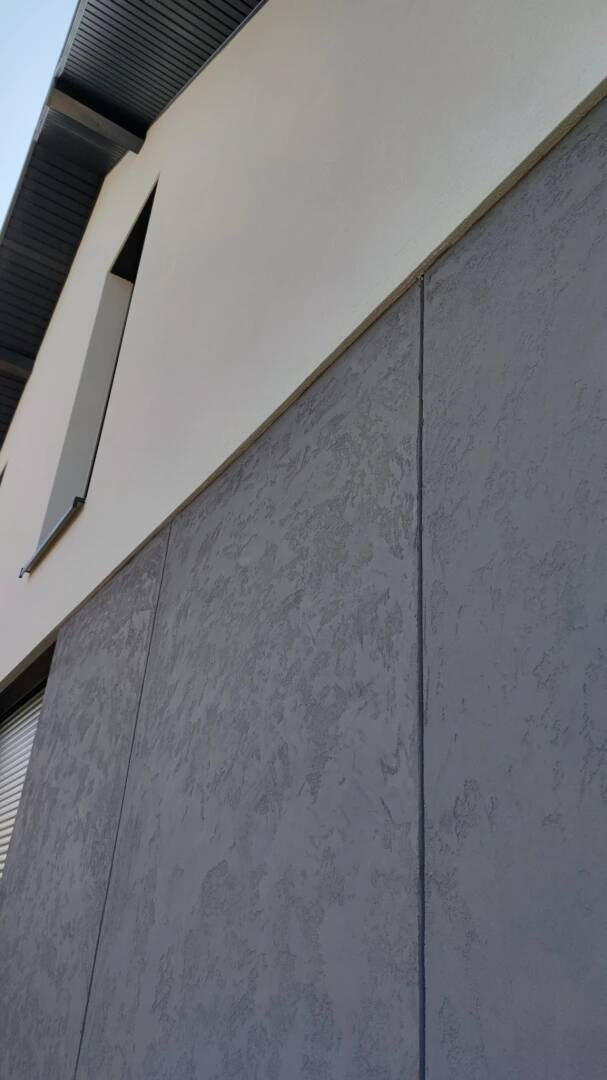 Do wykonania efektu betonu użyjemy GREINPLAST MSX – silikonowa masa strukturalna, która umożliwia wyrównywanie i wygładzanie zewnętrznych silikonowych wypraw tynkarskich o różnych strukturach, nadając powierzchni gładkość z minimalną fakturą. Produkt ten pozwala także na tworzenie nietypowych, dekoracyjnych faktur elewacji, dzięki czemu można uzyskać efekt nowoczesnego, surowego betonu