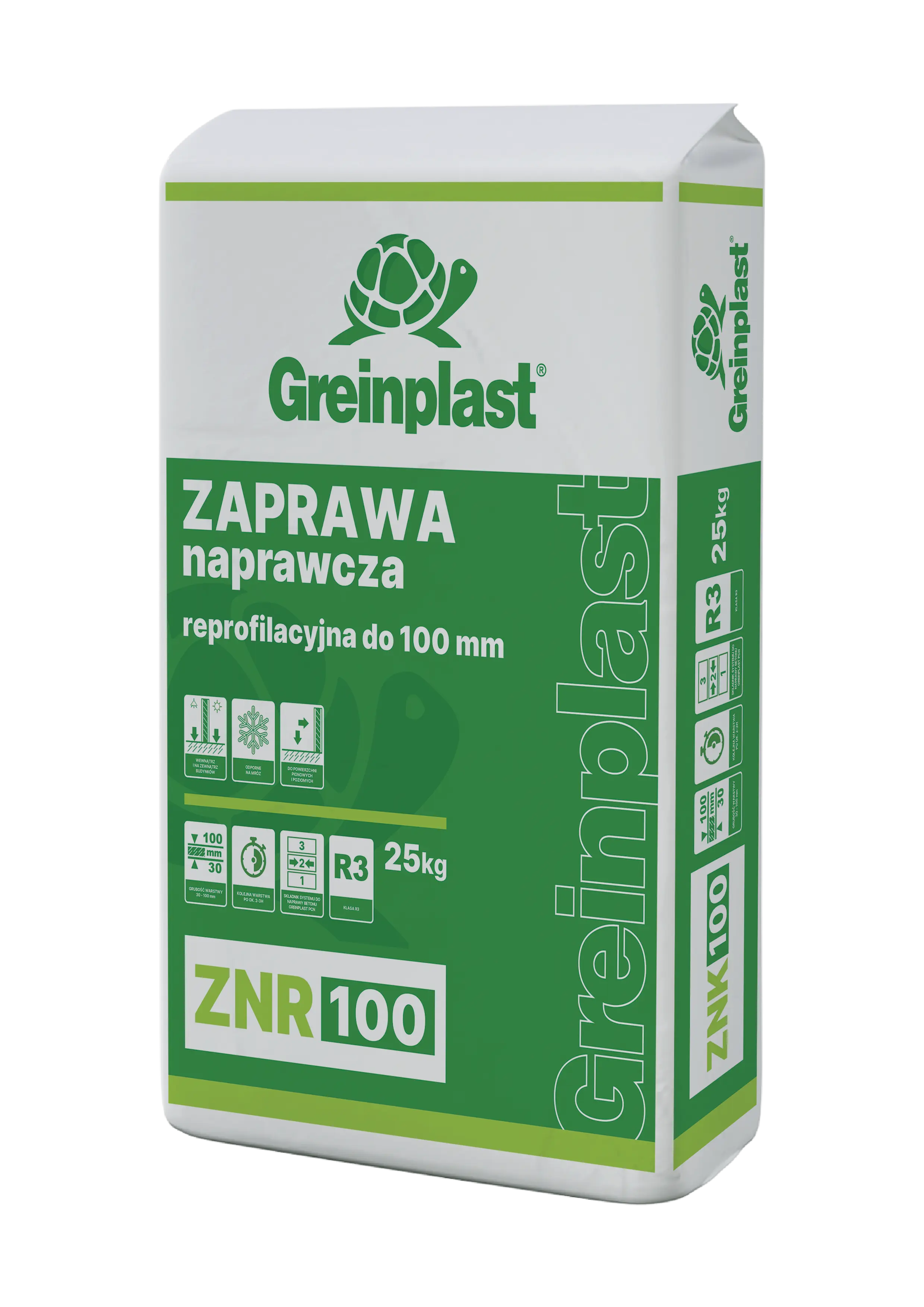Zaprawa naprawcza reprofilacyjna - GREINPLAST ZNR 100 to polimerowo - cementowa zaprawa w systemie naprawczym GREINPLAST PCN. Umożliwia odtworzenie zniszczonych lub skorodowanych obszarów powierzchni betonowych i żelbetonowych. Jest zaprawą o znakomitych właściwościach aplikacyjnych i wytrzymałościowych umożliwiających szybką reprofilację zniszczonych powierzchni w warstwie do 100 mm. Wyrób jest przeznaczony do uzupełniania znacznych ubytków, reprofilacji płyt balkonowych schodów, napraw różnego typu konstrukcji betonowych i żelbetowych. Umożliwia wykonywanie napraw konstrukcji w sytuacjach, gdy doszło do ich uszkodzeń i destrukcji. Nadaje się do naprawy elementów takich jak: balkony, schody, słupy, belki i dźwigary konstrukcyjne, stropy w obiektach budowlanych, konstrukcje szkieletowe i wielkopłytowe, baseny, konstrukcje żelbetowe, itp.