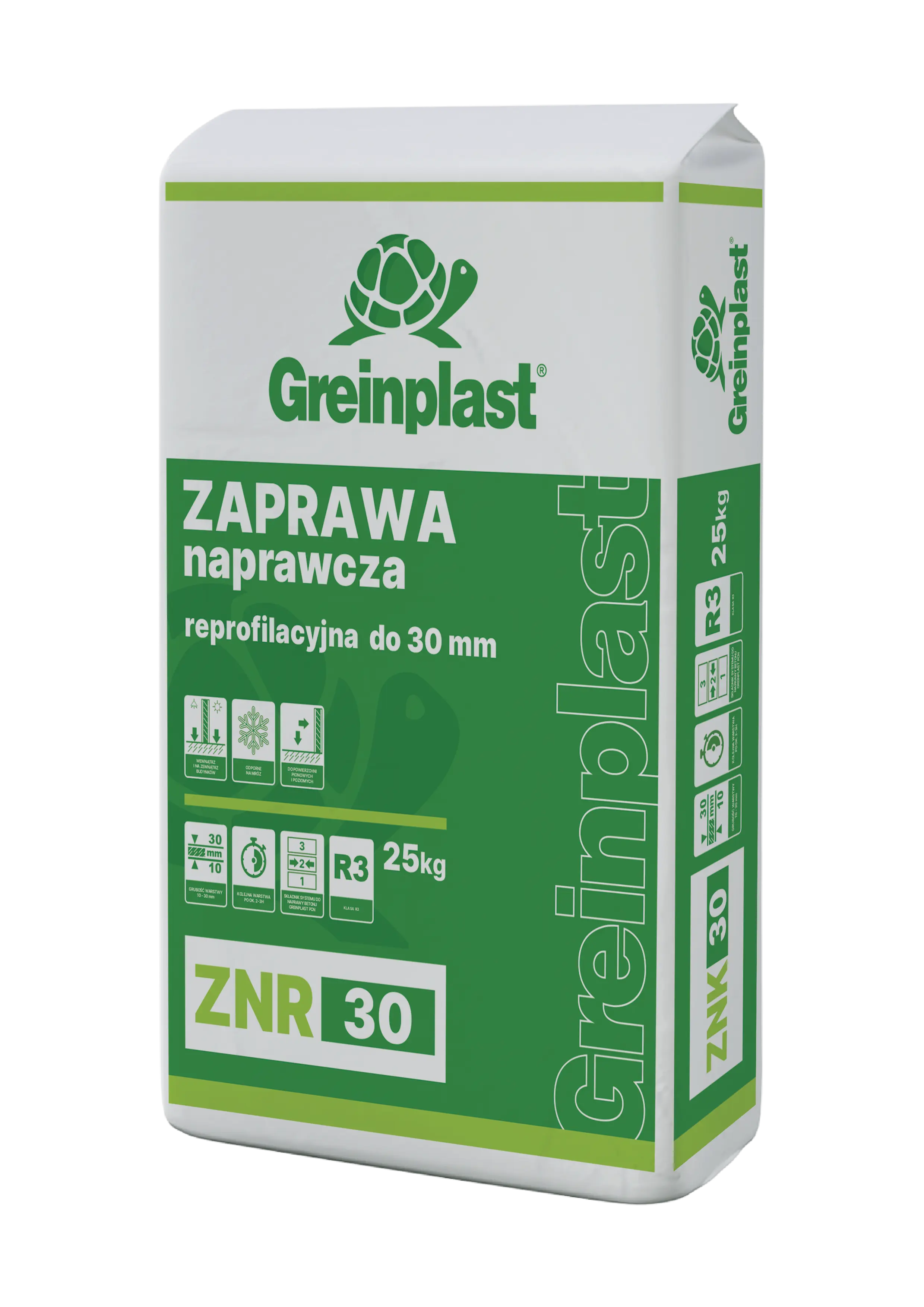 Zaprawa naprawcza reprofilacyjna - GREINPLAST ZNR 30 to polimerowo - cementowa zaprawa w systemie naprawczym GREINPLAST PCN. Umożliwia odtworzenie zniszczonych lub skorodowanych obszarów powierzchni betonowych i żelbetonowych. Jest zaprawą o znakomitych właściwościach aplikacyjnych i wytrzymałościowych umożliwiających szybką reprofilację zniszczonych powierzchni w warstwie do 30 mm. Wyrób jest przeznaczony do uzupełniania znacznych ubytków, reprofilacji płyt balkonowych, schodów, napraw różnego typu konstrukcji betonowych i żelbetowych. Umożliwia wykonywanie napraw konstrukcji w sytuacjach, gdy doszło do ich uszkodzeń i destrukcji. Nadaje się do naprawy elementów takich jak: balkony, schody, słupy, belki i dźwigary konstrukcyjne, stropy obiektów budowlanych, konstrukcje szkieletowe i wielkopłytowe, konstrukcje, baseny, konstrukcje żelbetowe, itp.
